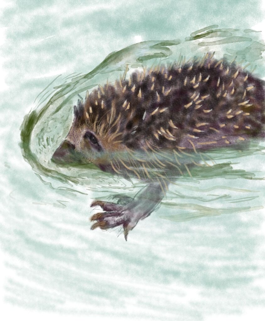 Tegnap reggeli séta közben azt vettem észre, hogy valami nagyobbacska fura dolog mozog a medencében. Közelebb menve láttam, hogy egy sündisznó kapálódzik, illetve szabályos kutyaúszásban halad a medence oldala felé. Nem tudom mióta küszködött szegény, de gyorsan kihalásztam. Eleinte összegömbölyödve pihegett a hálóban, aztán lassan kezdett kinyújtózni, kezét, lábát nyújtogatta, hosszú orrával szimatolt. Letettem a napra száradni és biztos ami biztos, elzártam a kutyát, hogy ne férjen hozzá.